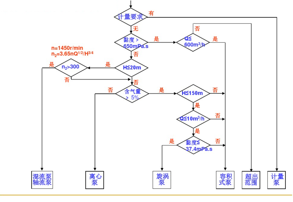 水泵的類型應根據(jù)裝置的工藝參數(shù)、輸送介質(zhì)的物理和化學性質(zhì)、操作周期和泵的結構特性等因素合理選擇。圖1-2為泵類型選擇框圖,可供選型時參考。根據(jù)該框圖可以初步確定符合裝置參數(shù)和介質(zhì)特性要求的泵類型。離心泵具有結構簡單、輸液無脈動、流量調(diào)節(jié)簡單 等優(yōu)點,因此除以下情況外,應盡可能選用離心泵。